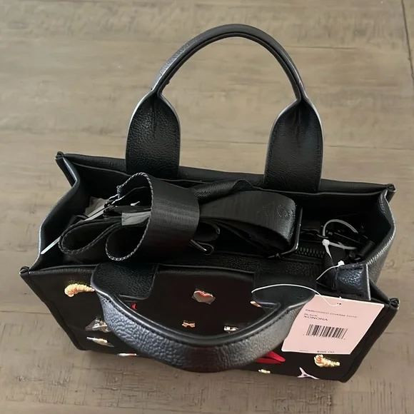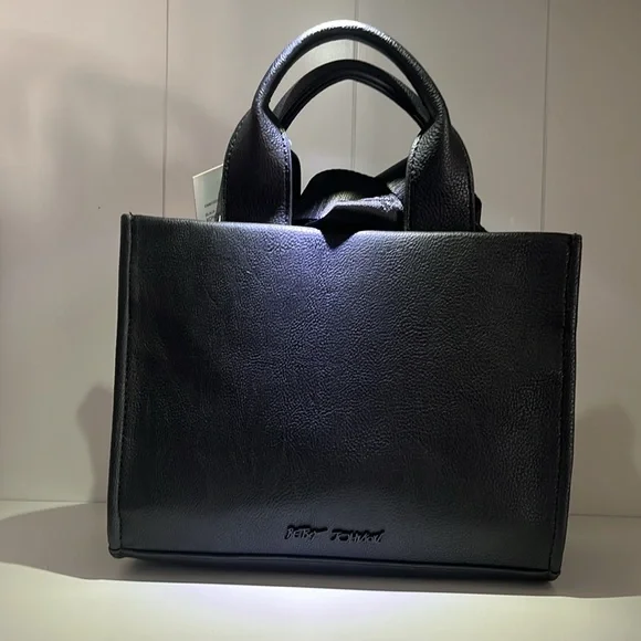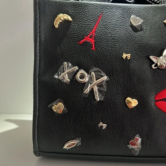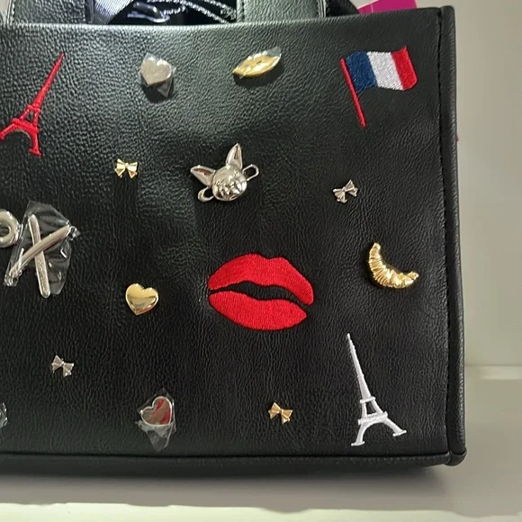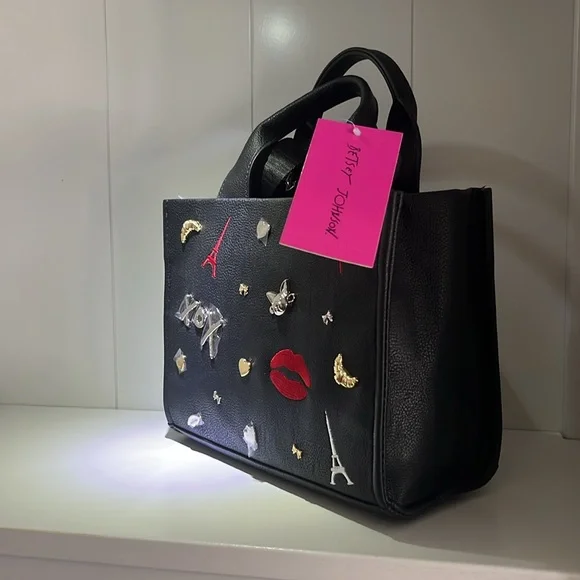 Pattern: Solid, Parisian Charms• Double top handles• Removable crossbody strap• Zipper closure• Interior: One zip pocket, Two slip pockets• Handle Drop: 4 "• Care: Spot Clean• Material: Man Made• Product Height: 7 1/2"• Product Width: 9 3/4"• Product Depth: 4"Brand New Betsey Johnson Bag -XOX Betsey CollectionSquare Shaped Med Tote + Converts to Satchel Medium SizeBlack Matte with black hardware, handles/strapFeatures Embossed Charms on Front -DIMENSIONALMotif: Paris, French Bulldog, Eiffel Tower, Love, Lips, Moon, French FlagSome Charms Sewn & Some MetalBack is plain except for Black BJ Full Name LogoInterior: 1 small zippered pocketLining - black w/ white XOX heartsDual or Convertible Handle/Strap -Double Carry Satchel Handles w/ 4" drop1.5"W Nylon Strap - detachable & adj (guitar strap style)Ships Immediately Smoke Free Home