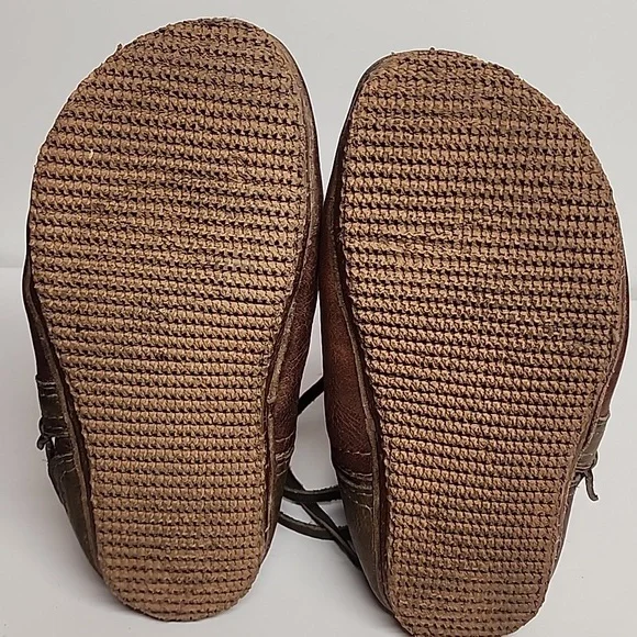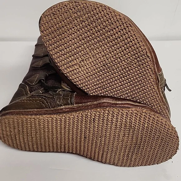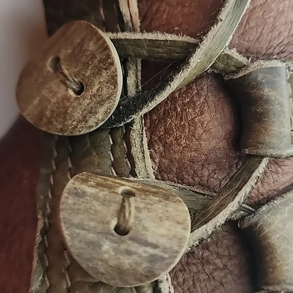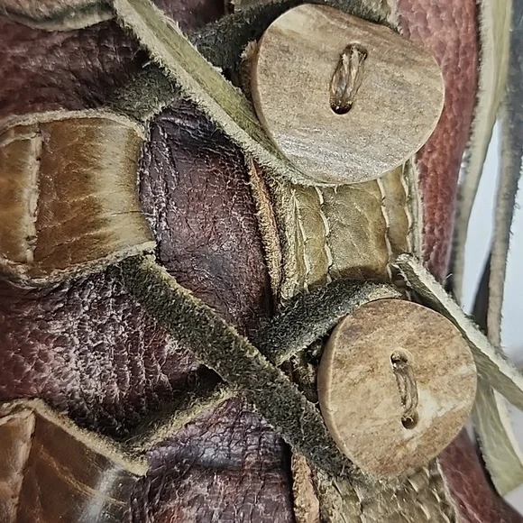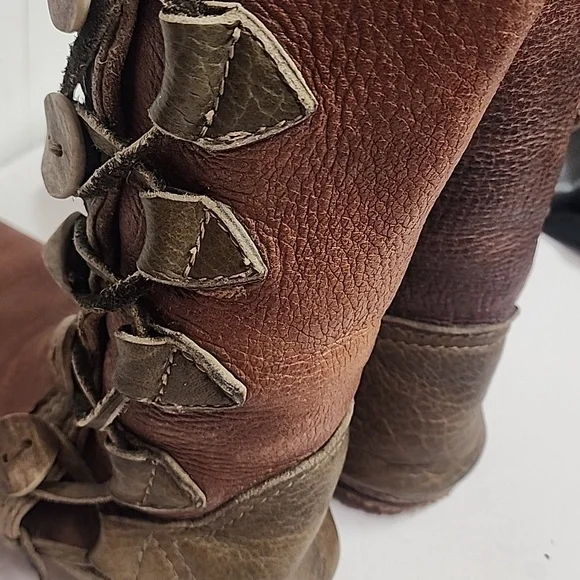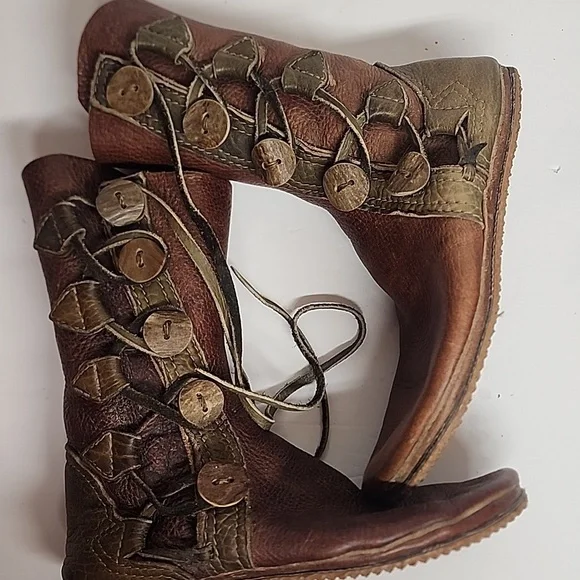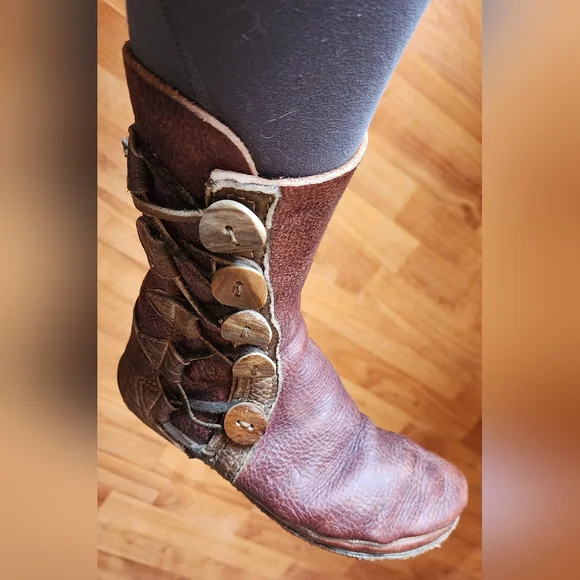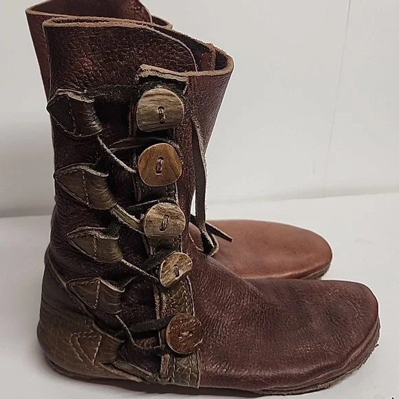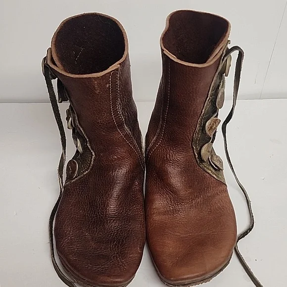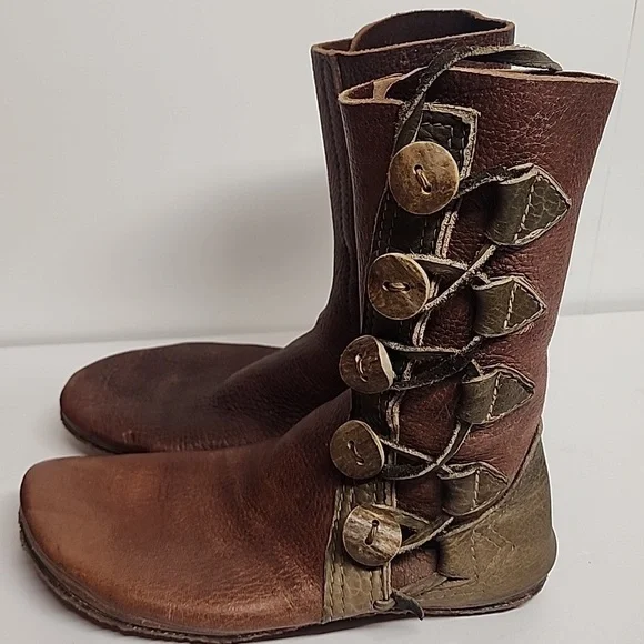 Handmade for the Renaissance Faire these unique brown & olive leather and antler button boots are a must-have to complete your Renaissance Faire attire.Pre-owned, distressed and well-loved but have lots of life left.They're custom-made but are equivalent to a womens size 8.5 or mens size 7.If you don't have the $650 and want a pair get them before they're gone at a fraction of the price.My ankle is 9" and 13" at the top of the boot.Please measure your foot before purchasing.UNISEX