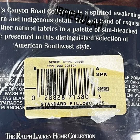 New Vtg Ralph Lauren DESERT SPRING Green Southwest 2 Standard Pillowcases NOSNew in its original packaging...unopened. The package contains 2 standard pillowcases. We also have 1 other Desert Spring standard pillow case in our store that has not been used but the packaging has been opened. Happy to combine shipping.We do not accept returns if the original packaging has been altered/opened and/or the item shows use in any way.