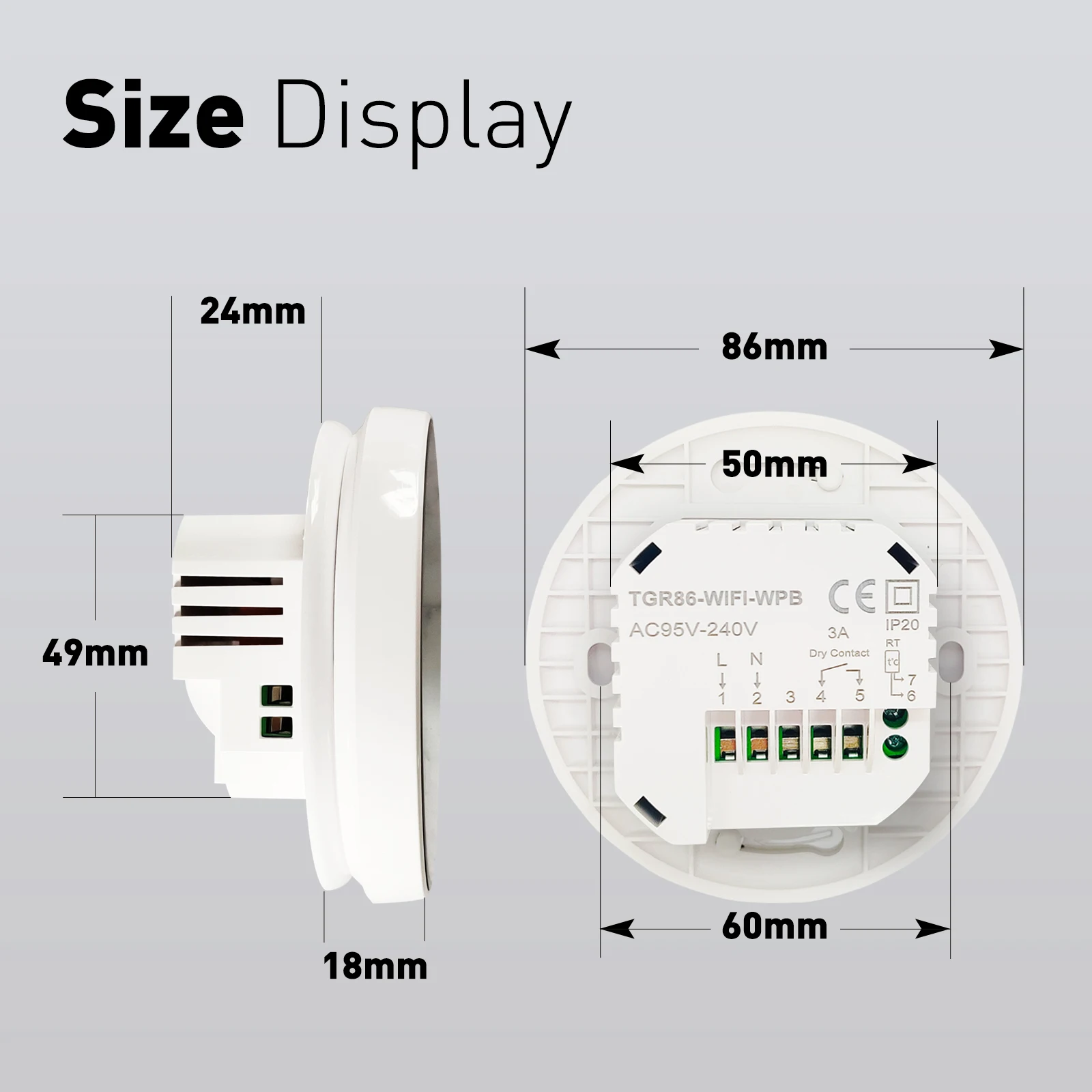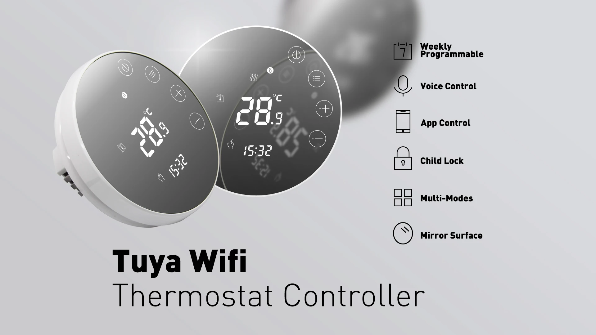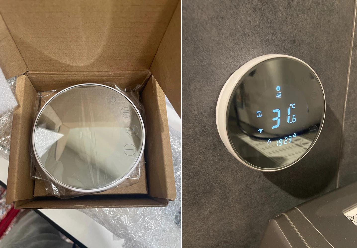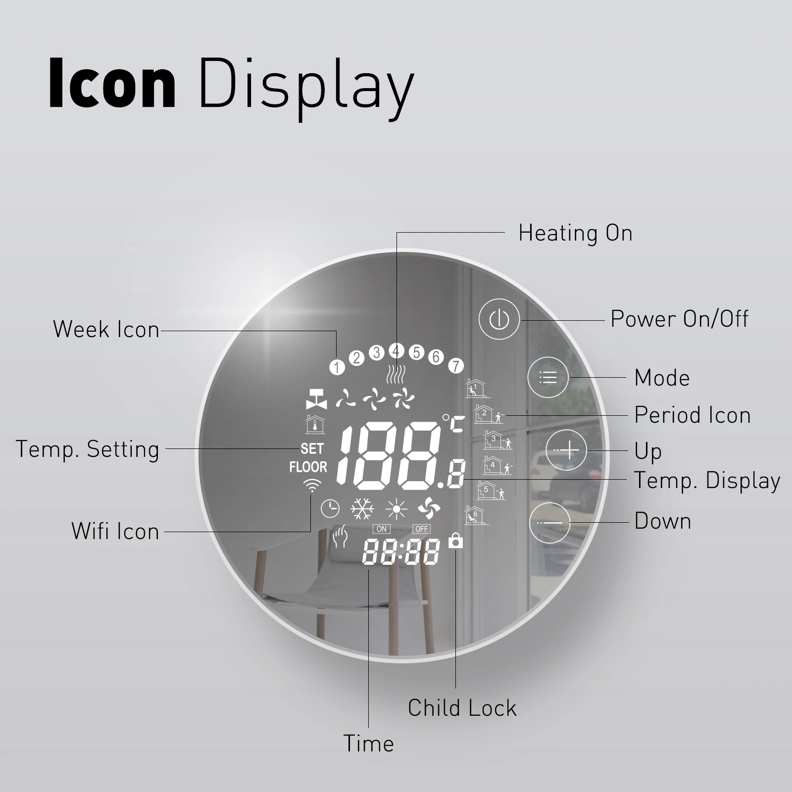 1. This product is a touch button thermostat with a large LCD screen. Its ivory white design and light blue display make it suitable for any style of decoration;