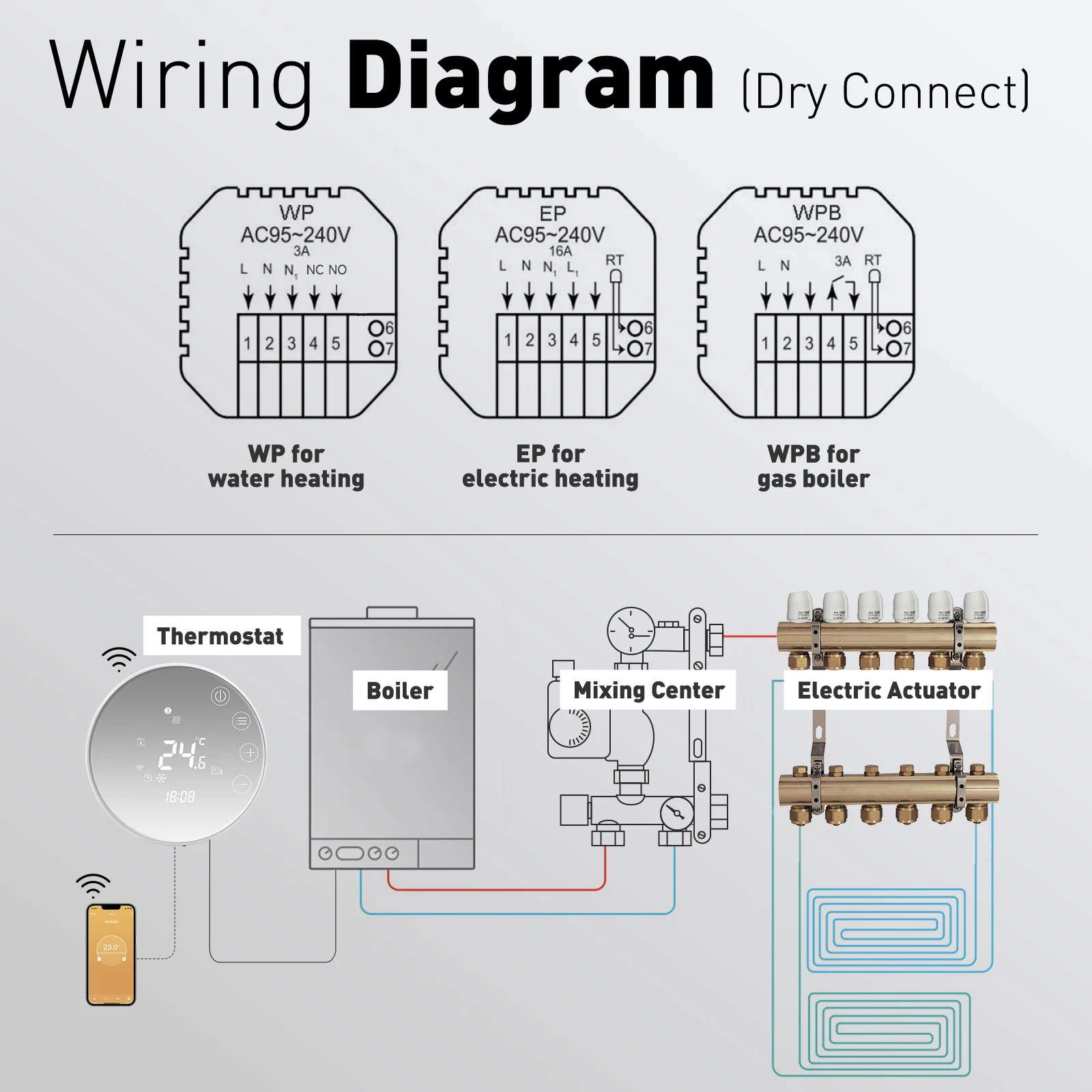 2. EP : 16A For electric heating. WP: 3A For water floor heating. 3A WPB: For gas boiler heating ;