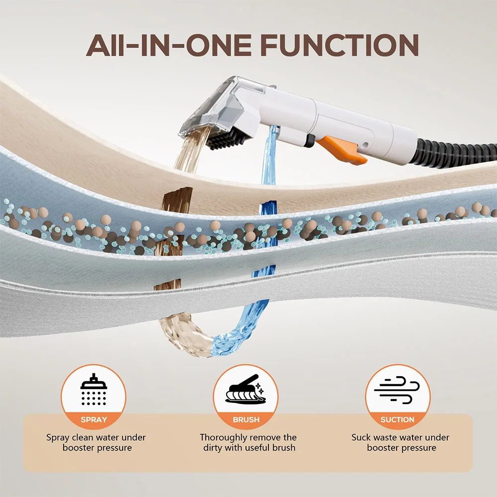 With a robust 450W power, our carpet cleaner delivers an impressive maximum suction power of 11KPa, ensuring deep and thorough cleaning stain spot of carpets and upholstery.