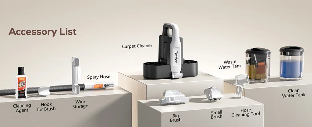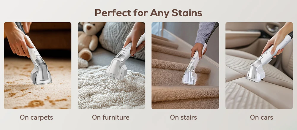 The cleaner includes both a large brush and a small brush, allowing you to select the right nozzle for different carpet types and upholstery surfaces, making it a highly adaptable carpet cleaning solution.