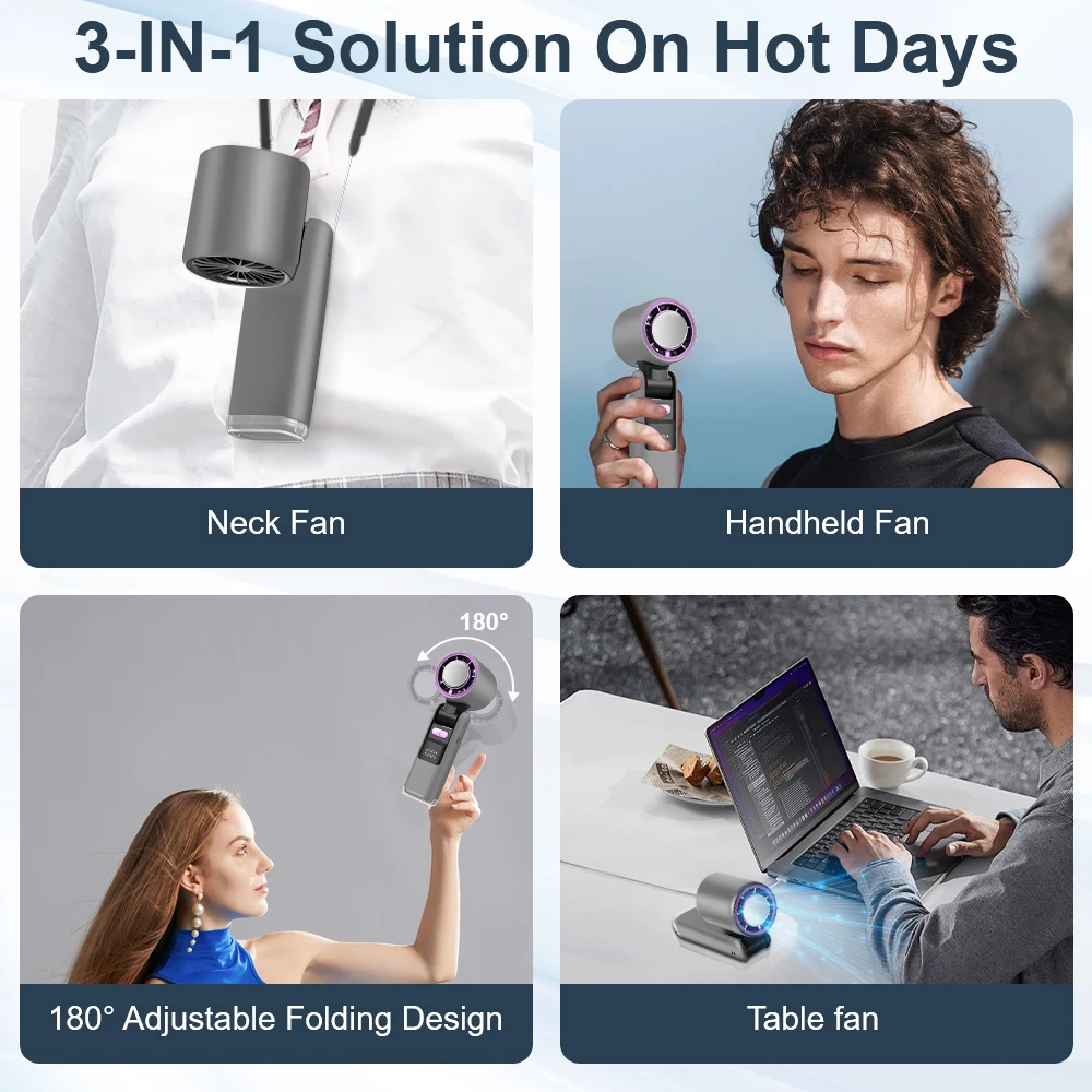 3-in-1 Portable Fan: Discover the ultimate convenience with our innovative handheld personal fan, designed to offer dual functionality. Seamlessly switch between a portable handheld fan and a practical desk fan to suit your needs. This mini fan comes equipped with a lanyard, allowing you to hang it on the neck for hands-free personal cooling. Super compact, lightweight, and easy to carry, it’s the perfect companion for work, walks, travel, makeup sessions, or shopping.180° Adjustables: The mini handheld fan folds 180° to fit any angle